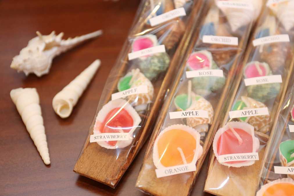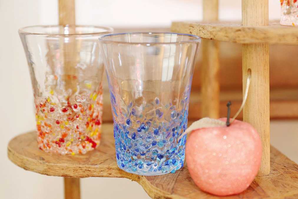 お店で使用している琉球ガラスのグラスは購入することもできます。貝殻キャンドルとセットにして、沖縄みやげにもぴったり。