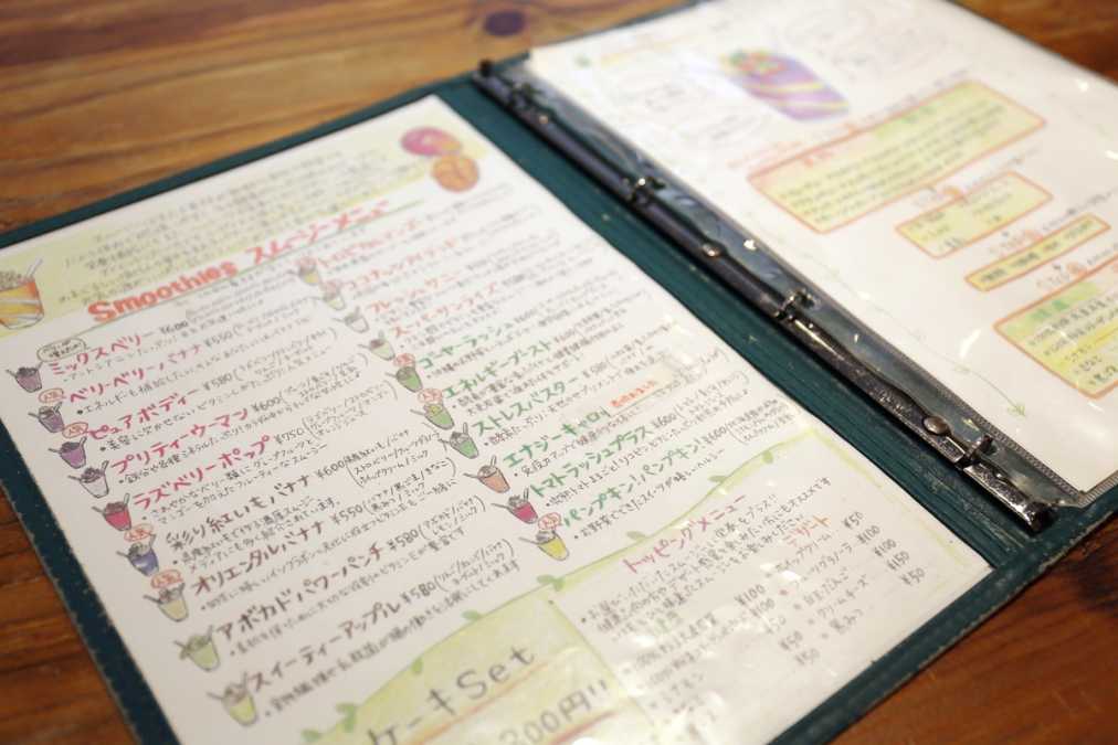 メニュー表や店内の壁に貼られた一覧表には、それぞれの栄養素や効果・効能が詳しく書かれています。「肌トラブル」や「二日酔い」、「季節の変わり目の不調」など、その日の体調に合わせてスムージーを選ぶことができます。