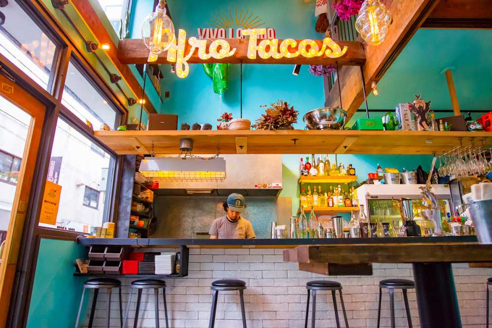 横浜の野毛地区はシブい焼き鳥屋さんからおしゃれなバルまで、さまざまな飲食店が集まり、はしご酒を楽しむ人で夜な夜な賑わう場所。なかでもライトブルーの壁面が目を引く「AFRO TACOS(アフロ タコス)」は、野毛では珍しいメキシカンダイナーです。
