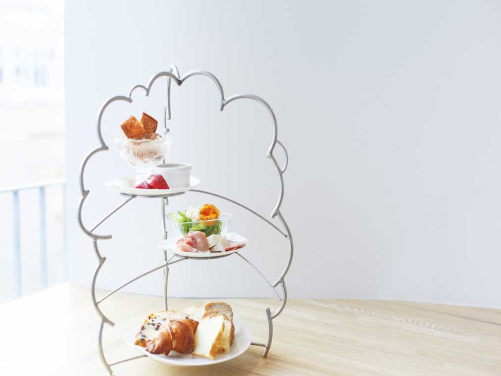 3階の「パンとエスプレッソと自由形」は表参道の人気店「パンとエスプレッソ」の姉妹店。雲の上をイメージしたという店内では、知る人ぞ知る毎朝限定5食の「ブランティーセット」(1000円)も楽しめます。アフタヌーンティのようなこちらのメニューは、焼き立てのカノン(クロワッサン)やハム、サラダなどがセットになったひと品。雲のモチーフのトレイもとってもキュートです。