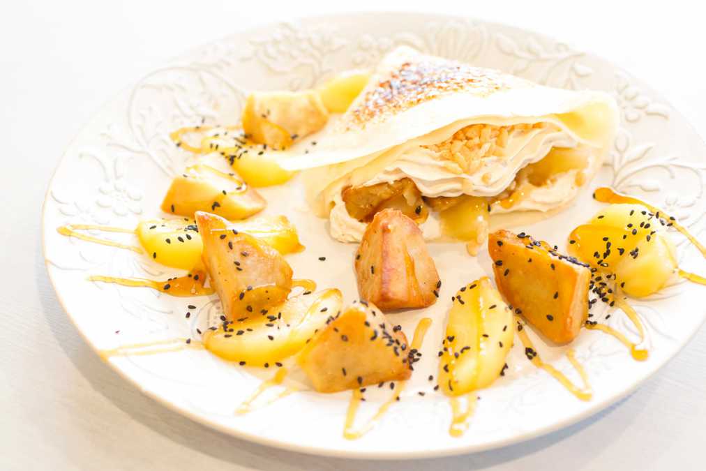 アップル大学イモのクレープ(1058円)もヴィーガン仕様。グルテンフリーの米粉クレープは、表面をブリュレ仕立てにカリッとキャラメリゼ。中には豆乳クリームとアップルフィリング、お皿には大学イモとみたらし団子ソースがトッピングされています。
