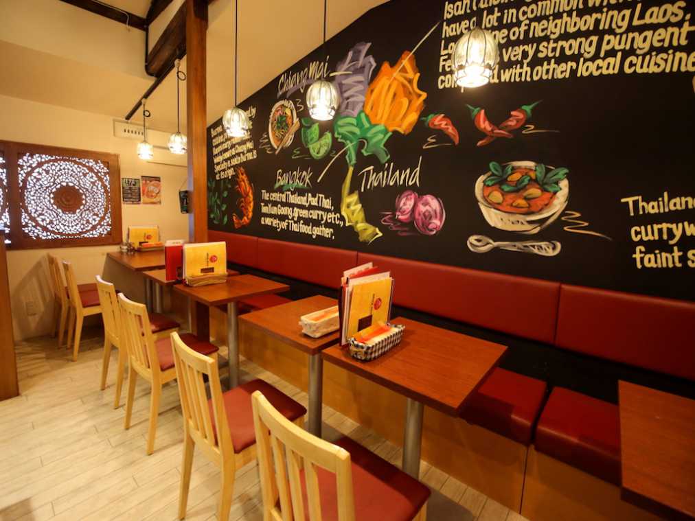 築60年以上の古民家をリノベーションしたという店内は、壁一面に描かれたタイの名物料理や食材のイラストが印象的。これはオーナーの知人が手がけたものだそうです。