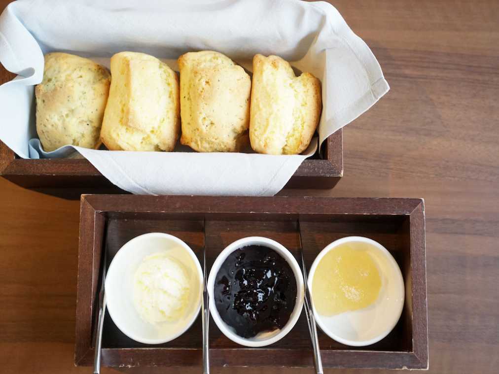 アフタヌーンティーの定番メニュー、スコーンも2種類付いてきます。クロテッドクリームと2種類のジャムを添えて。