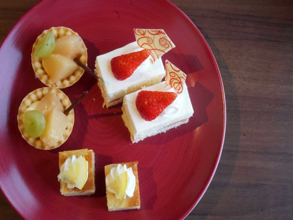 続いて、2段目に、ストロベリーショートケーキ、白桃のタルトレット、マドレーヌシトロン。白桃のタルトレットが、とくに絶品です!