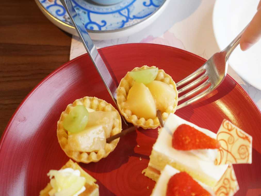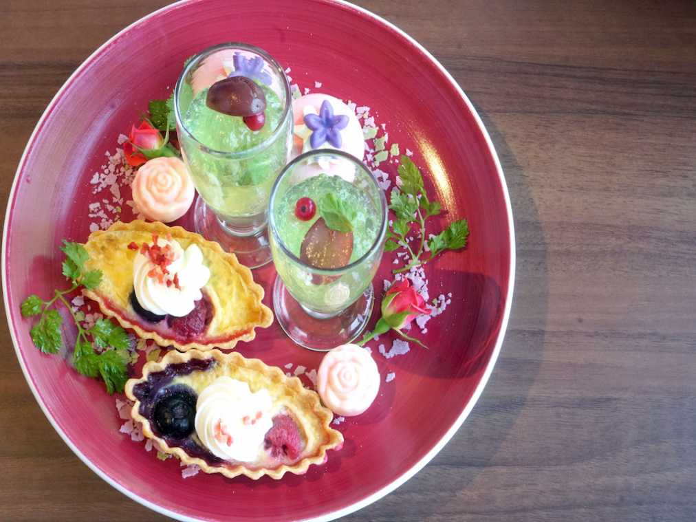 季節ごとのテーマでメニューが変わりますが、取材時のメニューは、まず上段から、マスカットゼリー、ラズベリージャムのマカロン、ミックスフルーツのカップケーキ。