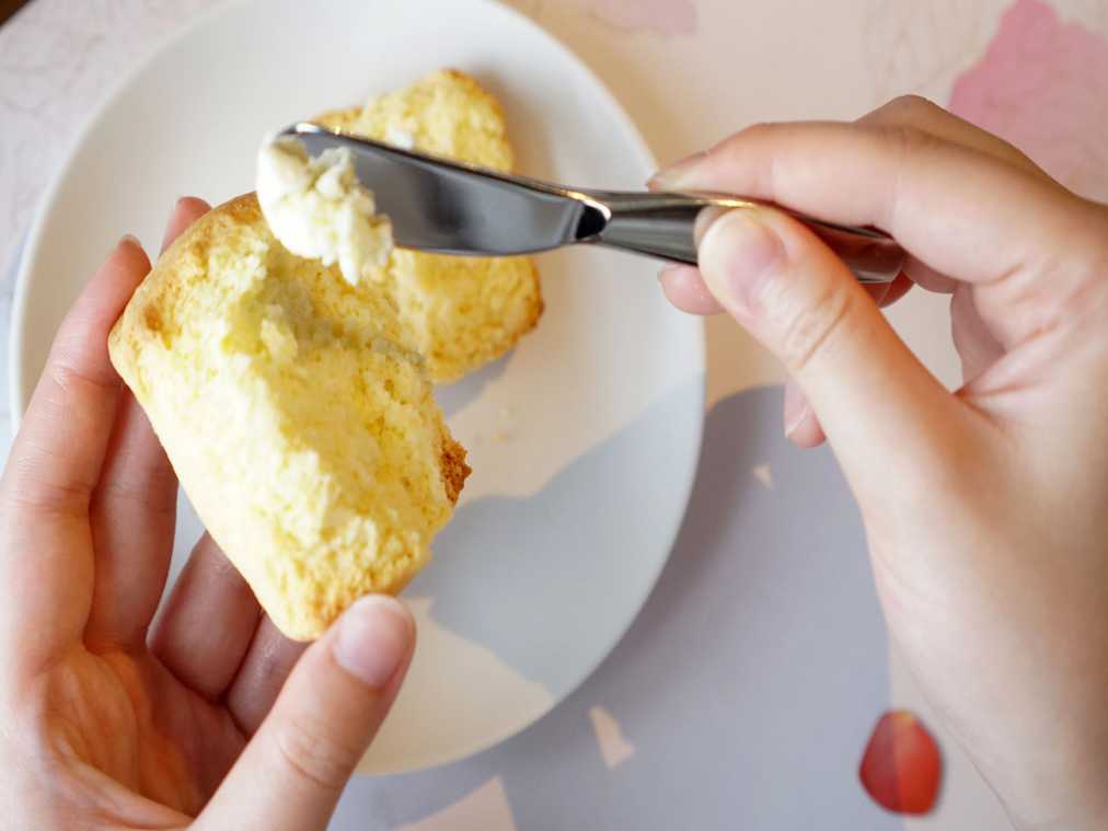 ただし、スコーンは手でとってOK。半分に割って、クロテッドクリームやジャムをつけていただきます。