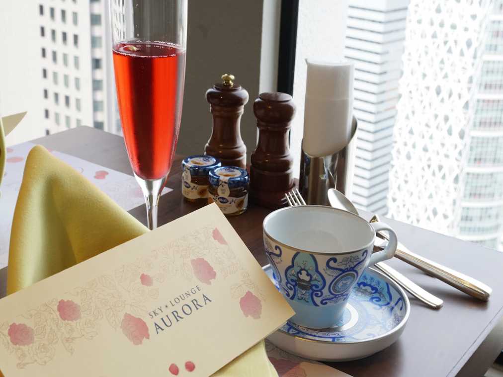 2021年に開業50周年を迎える「京王プラザホテル」は、西新宿高層ホテル群のランドマーク的存在。エレベータで45階まで上がり、やってきたのは、「スカイラウンジ<オーロラ>」です。まずはウェルカムドリンクがゲストをお出迎え。