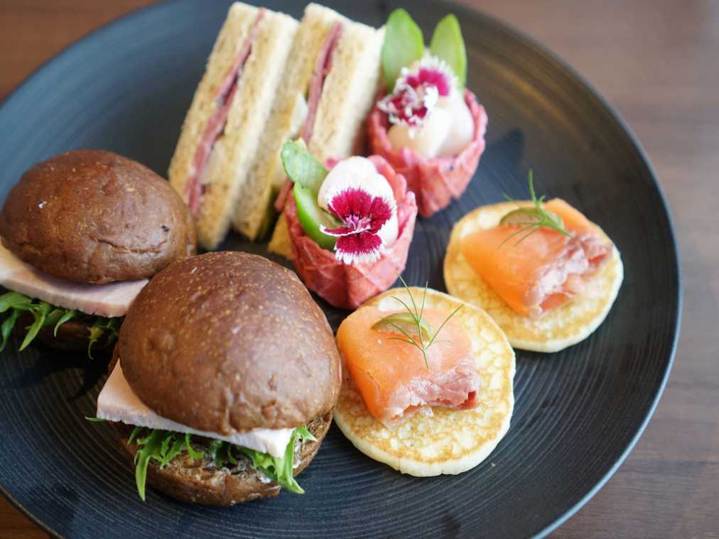 3段目はセイボリー、いわゆるスナックです。内容は、ビーフパストラミのサンドイッチ、雑穀入り黒蜜パンとジャンボンブランのサンド、スモークサーモントラウトとサワークリームのブリニーなどなど。