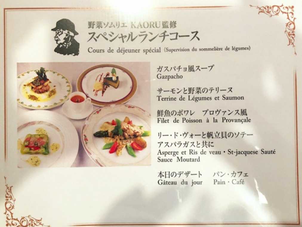今回紹介するは「野菜ソムリエKAORU監修・スペシャルランチコース」(4752円、税・サービス料込)。KAORUさんは、現在全国に5万人以上いる野菜ソムリエの第1号となったパイオニア。“野菜のあるライフスタイル”を提案し、野菜の魅力を伝えるべく精力的に活動しています。