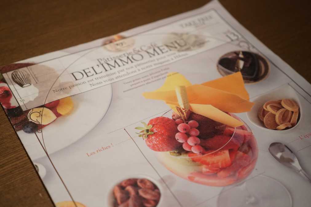 フリーペーパーのようなメニューにもこだわりが。パフェの中身を図解したり、シェフがオススメするスイーツとアルコールの組み合わせがチャート風に解説されていたり、読み物としても楽しめます。