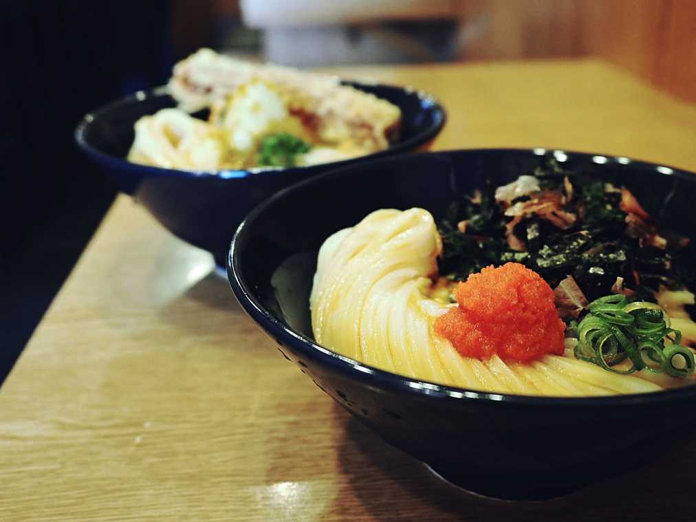 そんなこだわりのうどんがこちら!螺旋状に美しく盛られたツヤツヤの冷たいしょうゆうどんに、明太子、磯のり、そして温泉卵をトッピングした1杯です(すべてトッピングして1250円)。うどんと相性のいい、香川県産のまろやかな醤油をまわしかけていただきます。