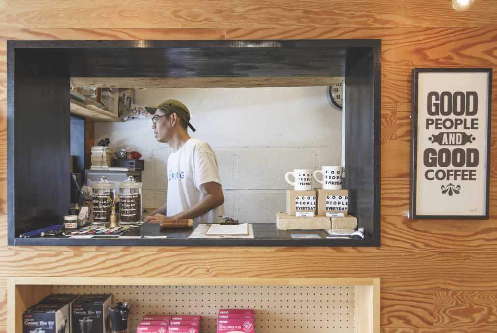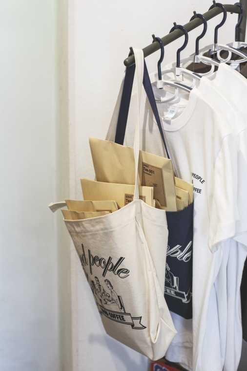 さまざまな人が集まるゆえ、可能性も広がる「グッド ピープル アンド グッド コーヒー」。店内は、つながりから生まれたTシャツやバッジ、マグカップなどオリジナルグッズに溢れています。