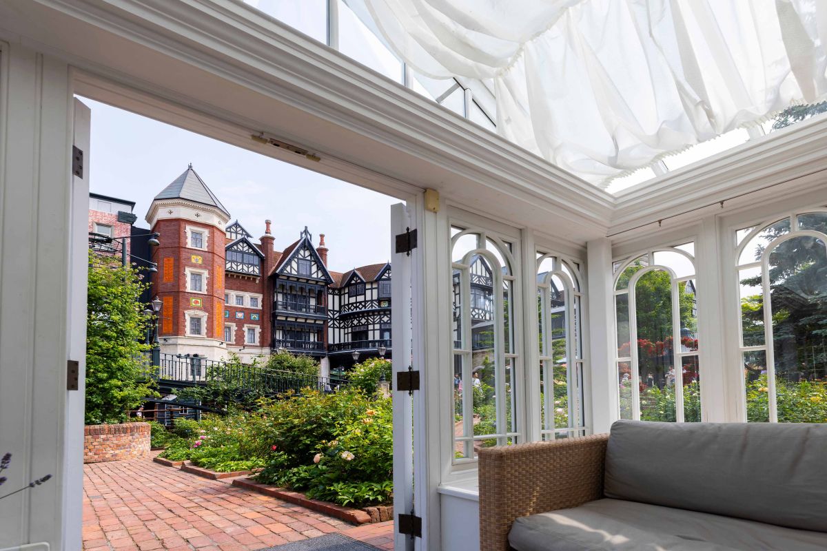 建物前に広がる美しい中庭(ローズガーデン)も無料エリアです。レンガが敷き詰められた英国風の庭で、約100種類のバラは6月下旬〜7月上旬がシーズン。バラだけでなく、チューリップやパンジーなど季節を通じて花がガーデンを彩ります。中庭にもソフトクリームやドリンクを販売するスタンドがあって、花に囲まれた寛ぎタイムが過ごせます。