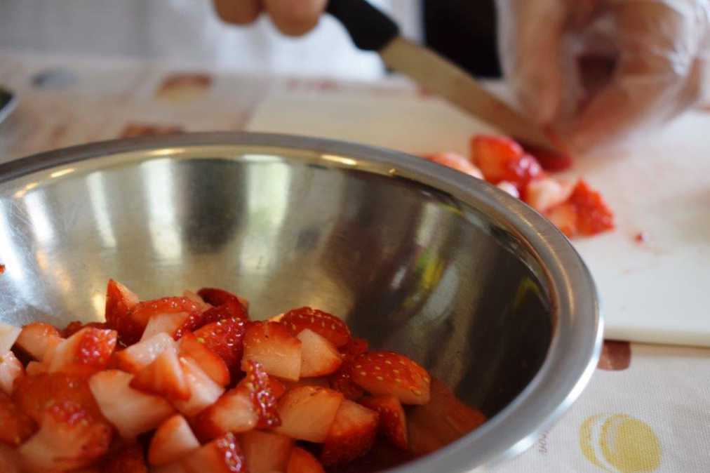参加者は毎回10人程度。カップケーキにいれるイチゴをみんなで協力してカットしていきます。