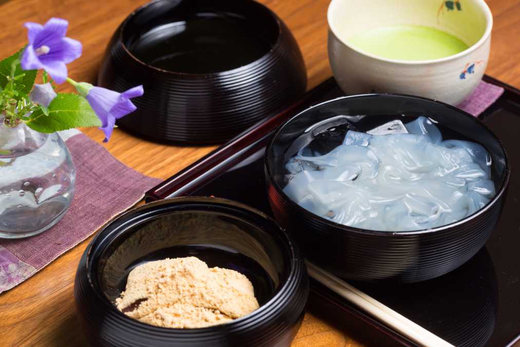 本葛100%で作るくずきりと本わらび粉やでん粉を独自の配合で練り上げた五福もちも、純和風の店内でゆっくりといただきたい一品。こちらは「布久セット」(1600円)です。