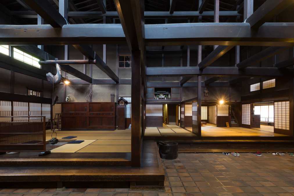 天領幕府時代に商家として栄えた日下部家の民家。国の重要文化財に指定されていて、江戸時代の高山の町家建築を知ることができます。二階建ての吹き抜けの母屋は、梁と束柱の力強い木組みが見どころ。また家の正面玄関の格子、煤で茶色にした木部の仕上げなども鑑賞ポイントです。