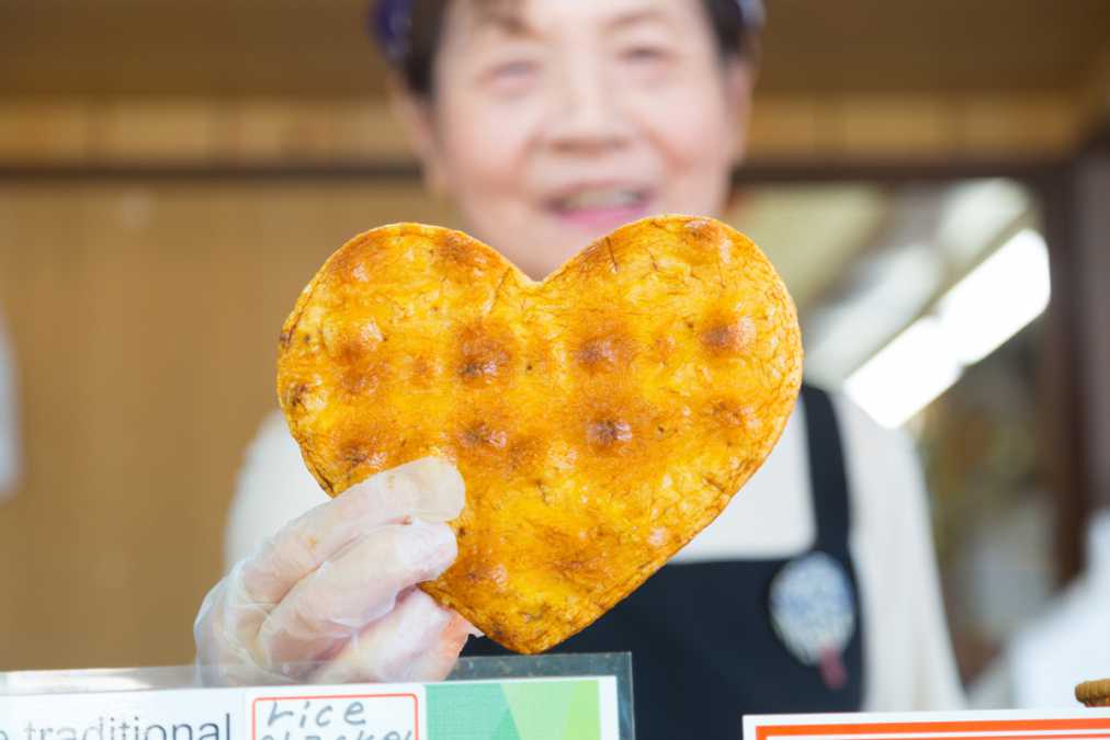 直径15cmはありそうな「手焼き煎餅堂ほうや」の「ハート型のおせんべい」(1枚200円)。目の前を通ると、おせんべいの香ばしい香りとお母さんの明るい笑顔に引き込まれてしまいます。