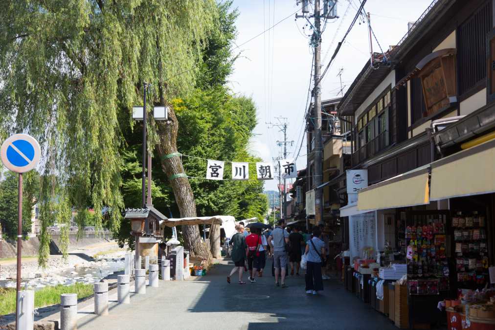 毎日7~12時、宮川沿いに40軒もの露店が並ぶ「宮川朝市」。江戸時代に米市や桑市として栄えた市場で、今は地元の農家で採れたての新鮮野菜や果物、郷土グルメ、土産物屋などが軒を連ねます。試食をしたり、見たことのない野菜の調理法を聞いたり、お店の人との交流も楽しみのひとつです。