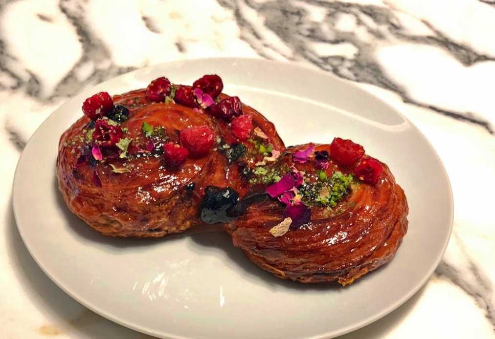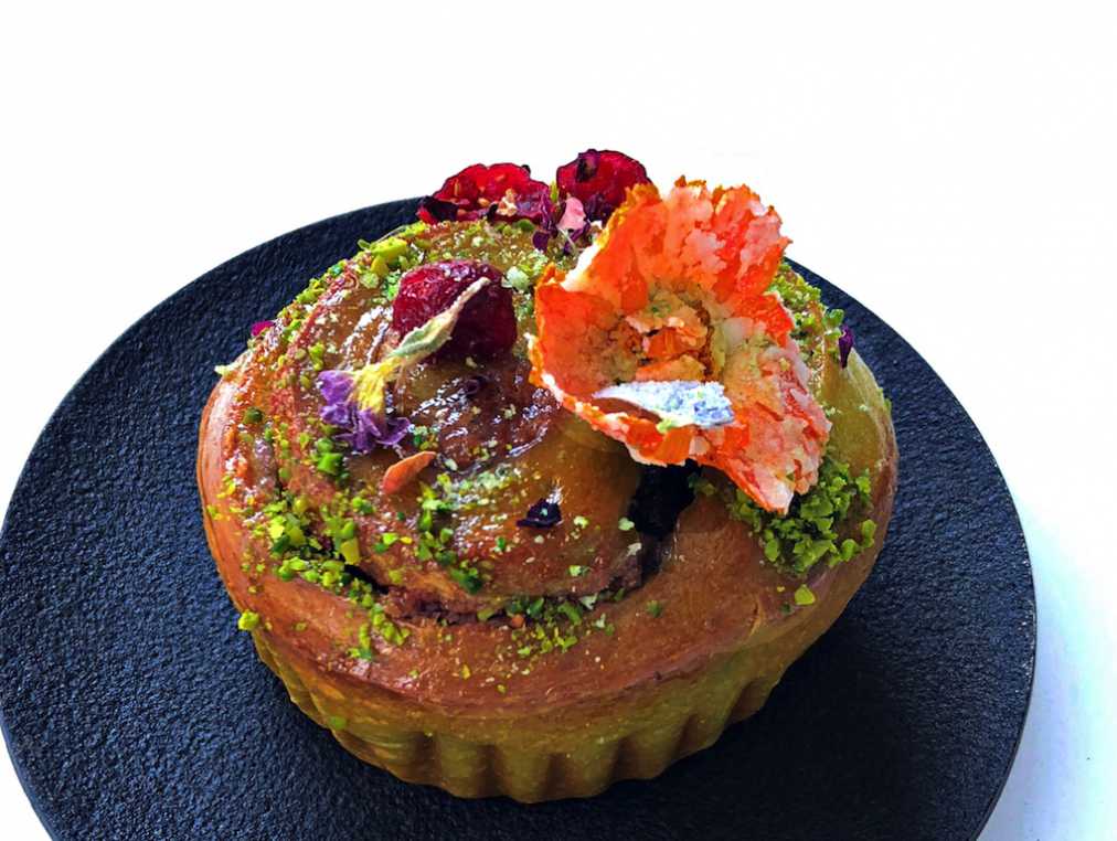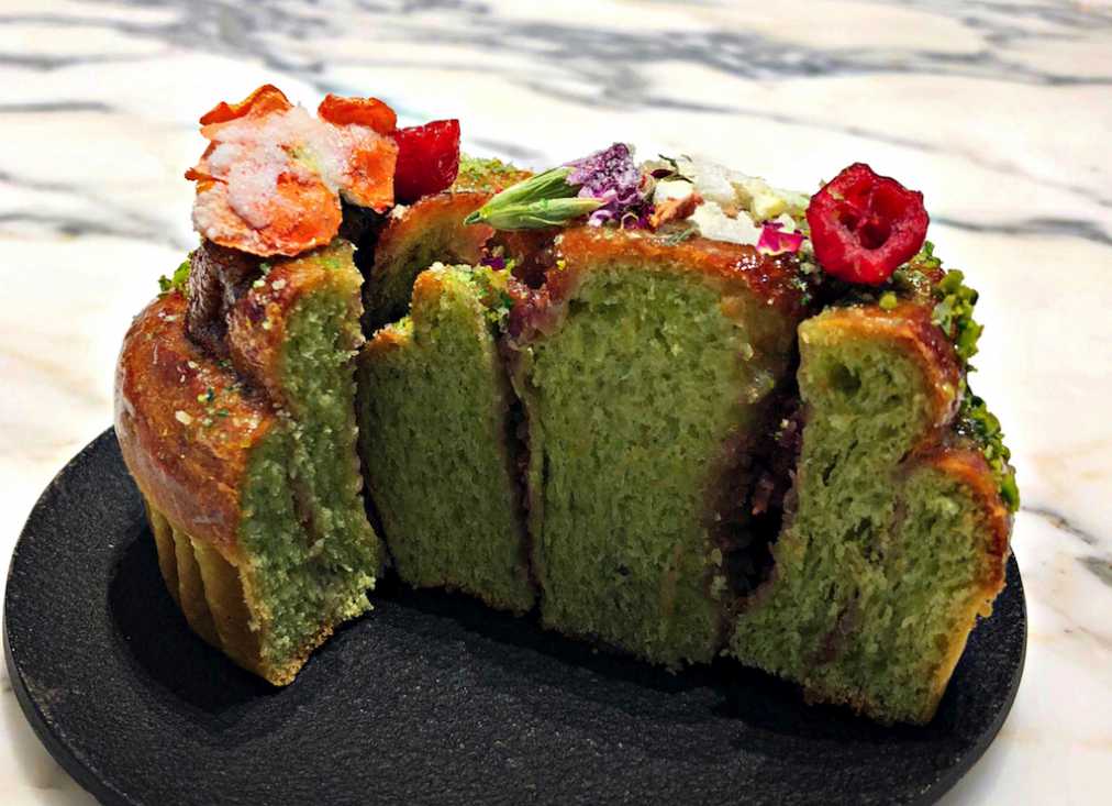 ローストしたピスタチオペーストが練りこまれたパン生地は濃厚な味!生地の間に入ったラズベリージャムと、赤く甘酸っぱい野菜のルバーブが甘酸っぱさを添えて、大人のスイーツパンという感じ。飾られたエディブルフラワーもサクサクとした食感で味にアクセントを添えています。