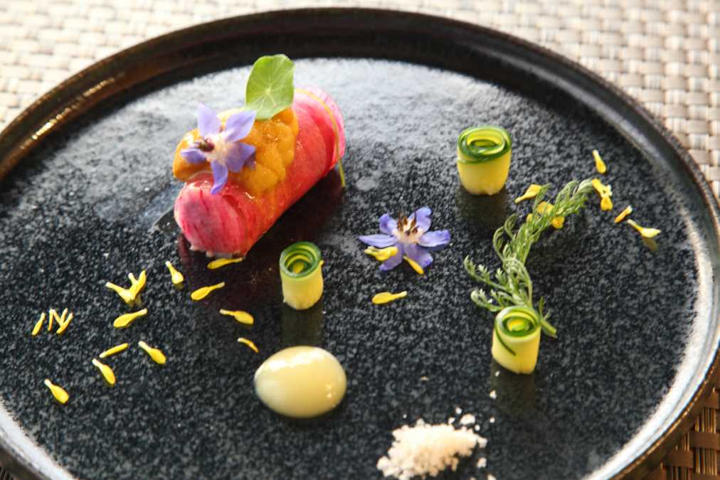こちらも同じくオードブルの一例。フルーツトマトのような味わいのフルティカトマトを敷き、ホタテとチョリソーを自家製マヨネーズで和えてドーム状に盛っています。上には、ハーブが生き生きと舞うように添えられています。