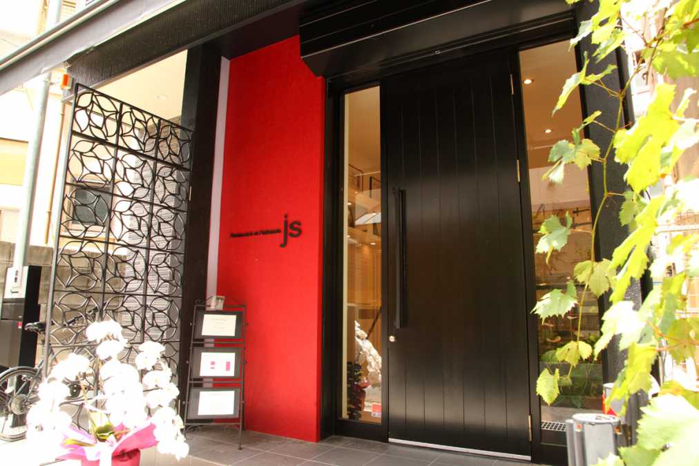 路地を一本入ったところ、民家や雑居ビルがひしめくなかに、赤色の壁と、黒の重厚な扉が印象的な一軒家があります。こちらが「レストラン エ パティスリー js」。