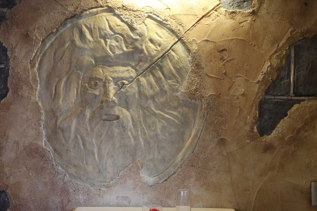 「真実の口」をモチーフにした壁面のデザインが印象的。これは“イタリア料理のお店なら”と、店内装飾を手掛けた職人さんの遊び心で造られたものだそう。