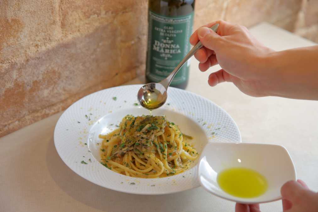パスタにさっとオイルを回しかけて味わってみると、アンチョビソースとの相乗効果で深みが増す味に変化します。
