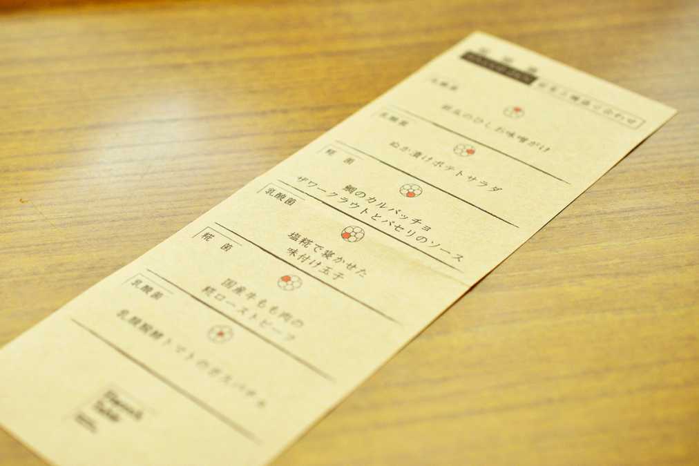 前菜のメニュー表を見れば、どのお皿にどんな「菌」が入っているかがひと目でわかります。乳酸菌に麹菌…、どれも体によさそう!