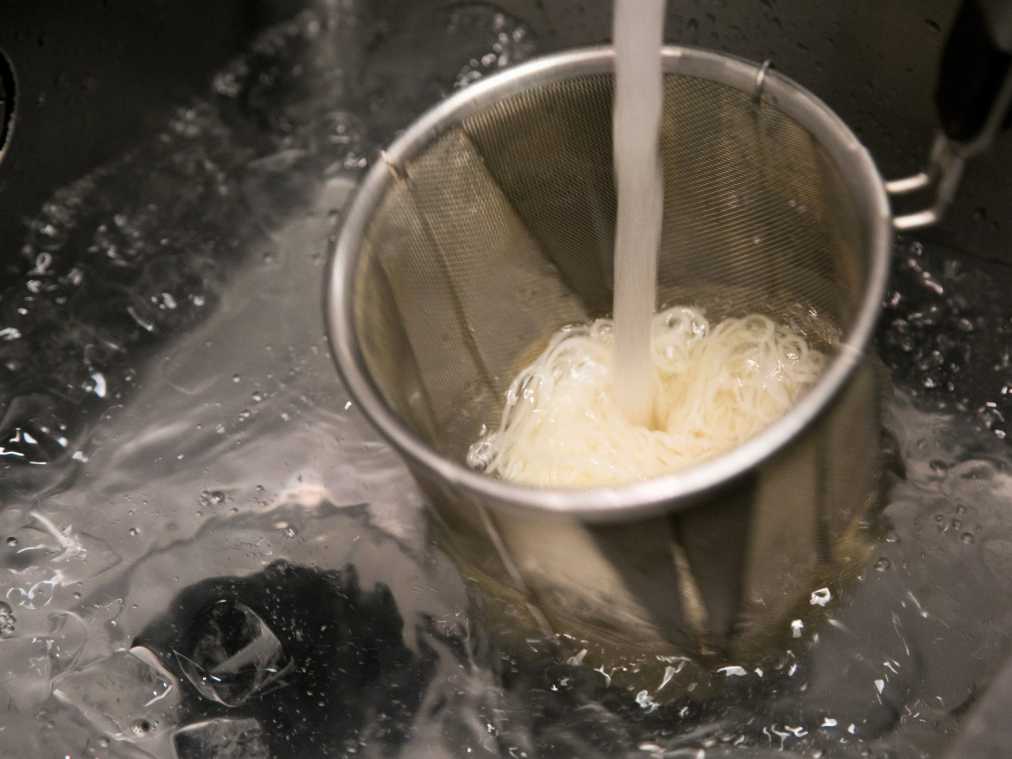 「島の光」の特徴であるなめらかな舌ざわりと、麺のうまみやコクが一層引き立つようにと、茹で時間は温メニューなら1分30秒、冷メニューなら2分と決めてあるそう。茹であがったら冷水でしっかり締めます。