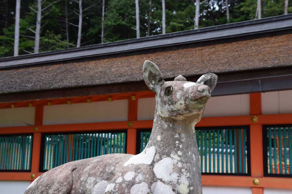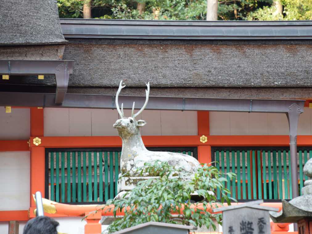 拝殿に進むと、狛犬ではなく、神鹿とよばれる狛鹿がいます。向かって右側は立派な角をもつオスの鹿が。
