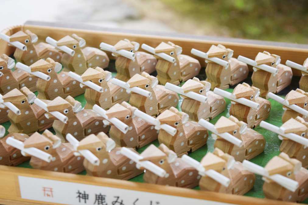 大原野神社のおみくじは、かわいらしい鹿の形!はっきりした記録はありませんが、50年ほど前から鹿のおみくじがあったそうです。綺麗に並んだ木製の鹿のなかから心を込めてひとつ引きます。