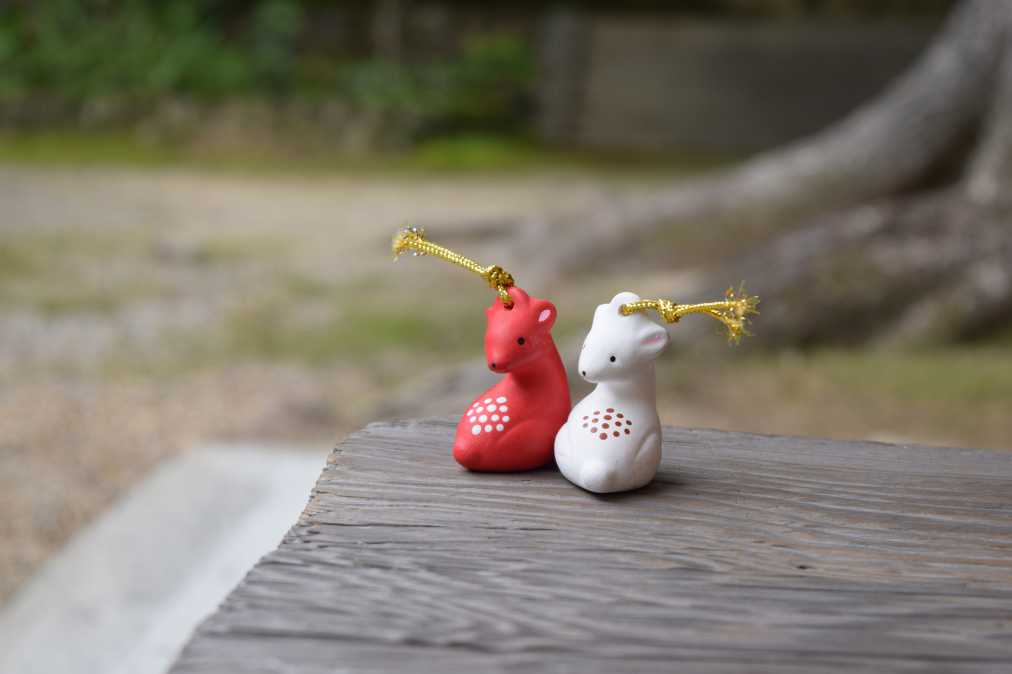 紅白の神鹿が振り向く姿がキュートなのは「神鹿土鈴」(一対 1000円)。良縁のご利益があるそうなので、素敵な恋をよんできてくれるかもしれません。