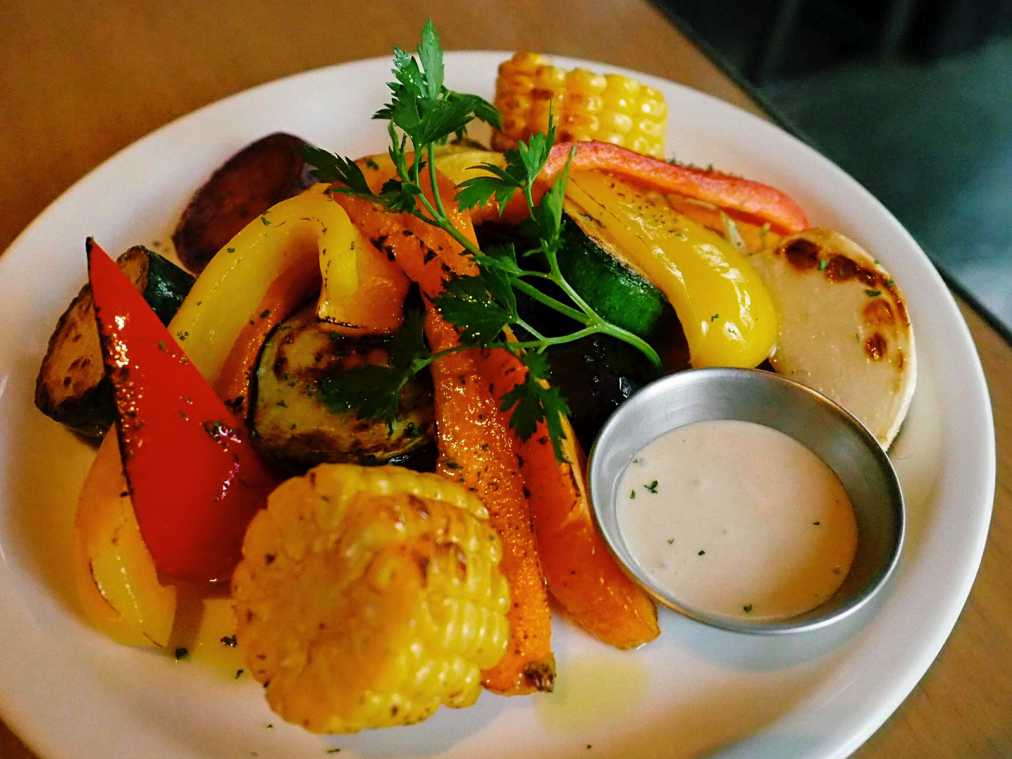 ビールに合わせたい、絶品フードも目白押しです!たっぷりと野菜が盛られた「季節野菜のグリル」(1200円)は、大胆にカットされた野菜をグリルし、シンプルに塩のみで味付けをしています。