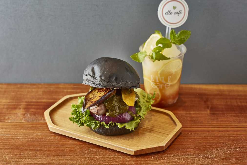 見た目にもびっくりの黒いバンズは、体内のクレンズをサポートする活性炭入り。鶏モモ肉のソテーに夏野菜、ほうれん草の薬膳カレーソースを挟んだ、ヘルシーバーガー「夏野菜とジャークチキンの薬膳カレーバーガー」1512円(エル カフェ)。六本木ヒルズ店の夏限定ドリンク「コンブチャフローズン」付きなのもうれしい!