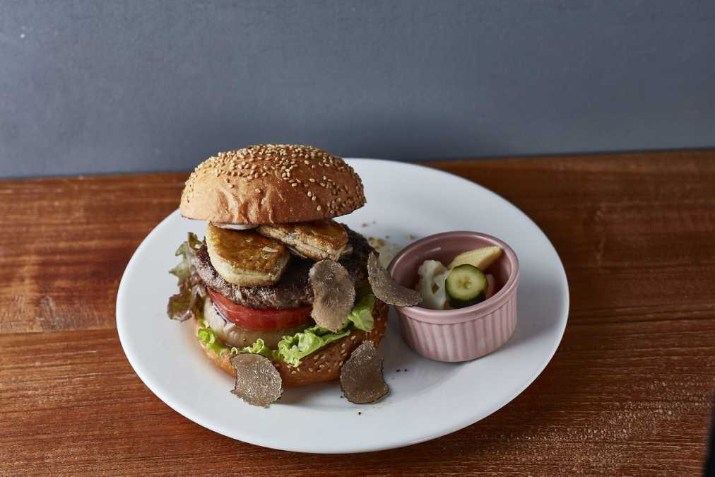 写真は、高級食材を使用しているだけあって、価格もラグジュアリーな「フォアグラ+Aランク山形牛のジューシーバーガートリュフ風味」2800円(ヒルズ ダル・マット)。レアに焼いたA5 ランクの山形牛パティにフォアグラとトリュフの香りが絶妙に絡み合い、最高級の味わいに。
