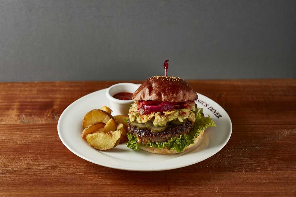 ハンバーガー専門店「エーエス クラシックス ダイナー」は、本場アメリカスタイルの2種類のバーガーで、特別限定メニュー、レギュラーメニューの両部門においてそれぞれ勝負に挑みます。(※写真は今年の限定メニュー「ジューシールーシー チーズバーガー」1550円)