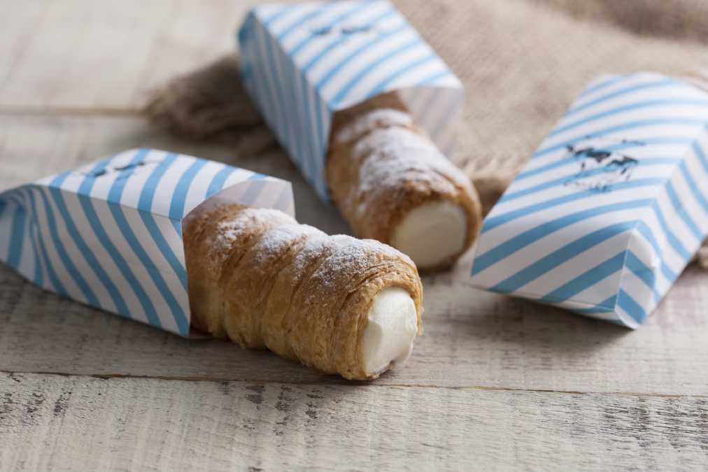 なんばウォーク店の新商品として登場するのが、店内で焼き上げたサクサクシューに包まれた「焼きたて濃厚生クリームシュー」!テイクアウトしても食べやすいコルネ状のシュー生地に、濃厚な生クリームがしっかり詰まっています。