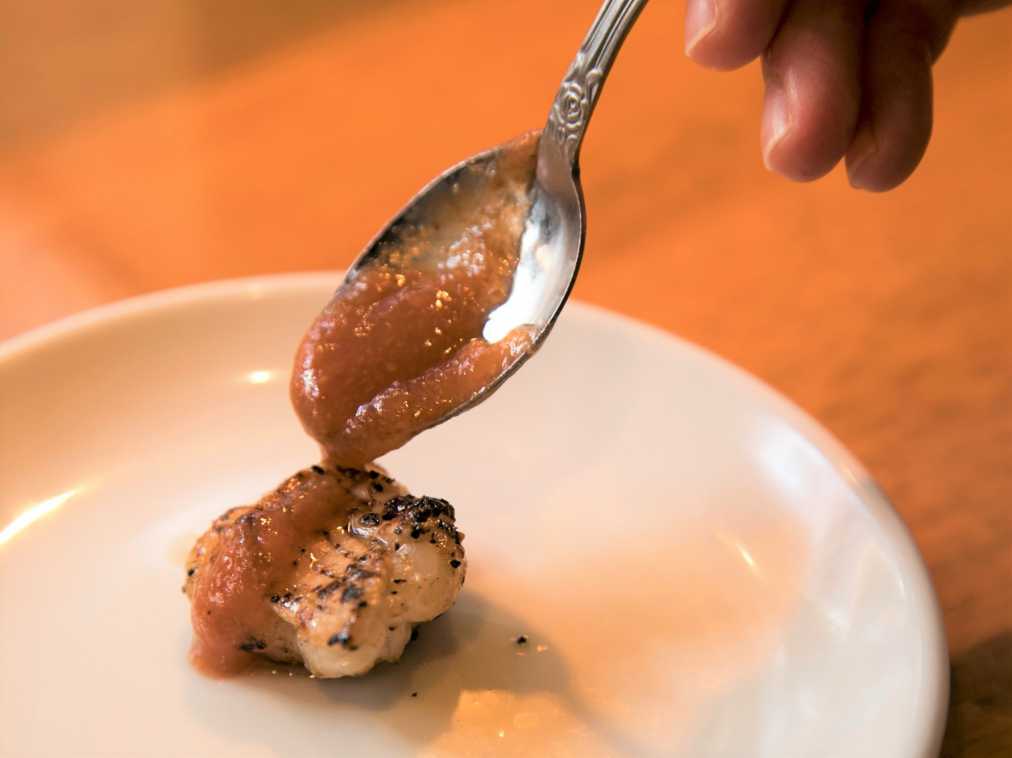 ハツに合わせるのは、すだちと山椒ダレです。1枚目のお肉はすだちでさっぱりと。2枚目は山椒の利いたタレでどうぞ。この山椒ダレは、コースだけでしか味わえないこだわりのタレなんですよ。