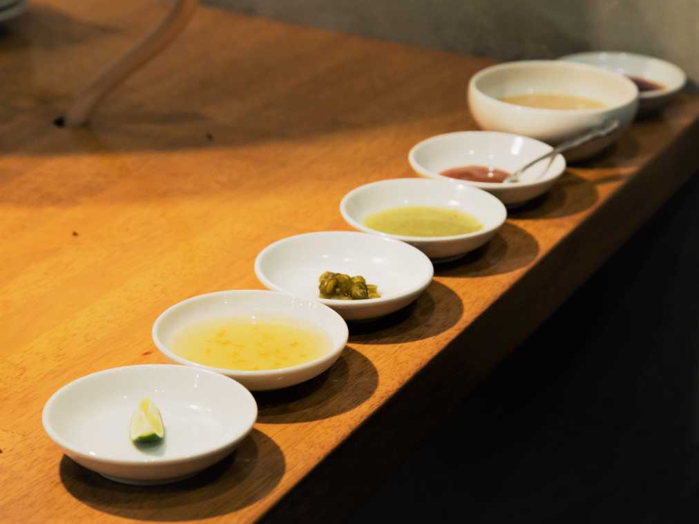 写真は4000円コースのオリジナルダレ。コースで提供されるお肉に合わせて、手前から順番にタレを使っていきます。ラインナップは、すだち・橙(だいだい)で作った塩ポン酢・ピクルス漬け青唐辛子・山椒ダレ・梅肉・とろろダレ・精肉ダレの全7種。