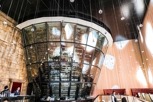 9mもある高い天井にガラスのワインセラーは圧巻。