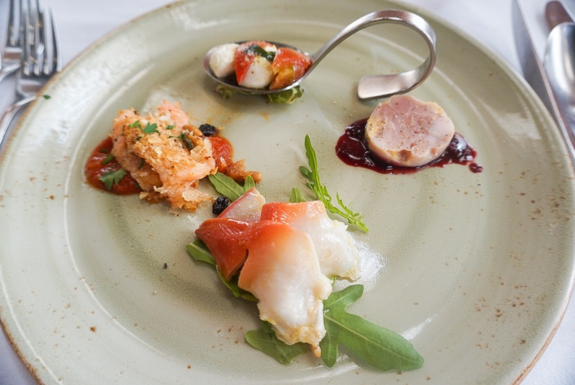 前菜は、ほっき貝と広川農園産根菜のマリネ、フルーツトマトとボッコンチーニのカプレーゼ、阿部鶏とフォアグラのテリーヌ ミックスベリーのソース、サーモンのパレルモ風 パン粉焼き。