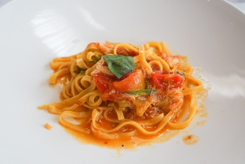 パスタは、自家製タリオリーニをセレクト。ずわい蟹とバジリコをトマトのソースでいただきます。