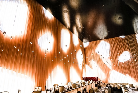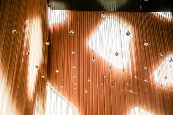 店内は、まさに“DAZZLE(=きらめき)”。スワロフスキーが天井から飾られ、きらめく、宝石箱を思わせるラグジュアリーな空間です。昼は大きな窓から光がたっぷり射し込み、きらきらとした光が舞います。