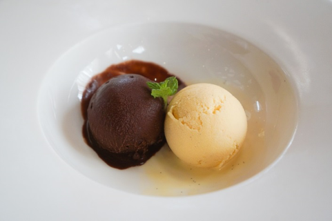 本日のジェラートとソルベの盛り合わせも、逸品。この日はバニラのジェラートにチョコレートのソルベ。