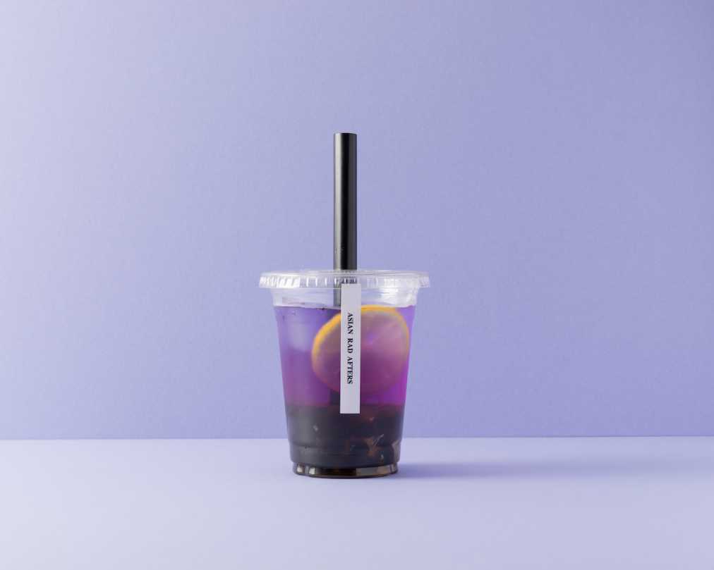ハーブティで色付けされたパープルのタピオカと本格抹茶とミルクが"着物"のような美しい層を描く抹茶ラテ系のタピオカドリンク。