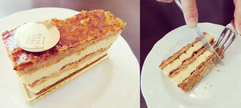 次にいただいたのは、人気ナンバー2の「ミルフォイユ」(540円)。バターの風味がしっかりきいたパリパリ触感のパイ生地に、バニラビーンズの入った甘くてコクのあるカスタードクリームがよく合います。「モンブラン」と一緒に買って帰るお客さんがほとんどで、口コミで人気が広がっていったケーキなのだとか。