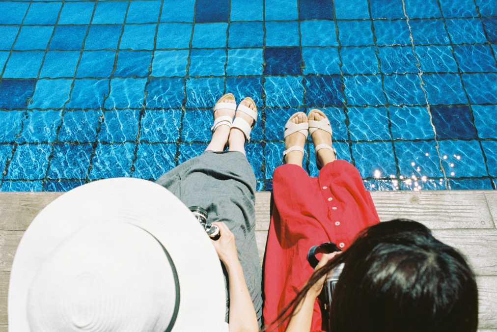 ウッドデッキの先は、ブルーのタイルに水が張られて、プールのようになっています。見るからに涼しげで、ずっとここでゆっくりしたい気分に。一段下にもウッドデッキが広がっているので、こんな写真も撮れます。人気エリアで人も多いのですが、チャレンジしてみてください。