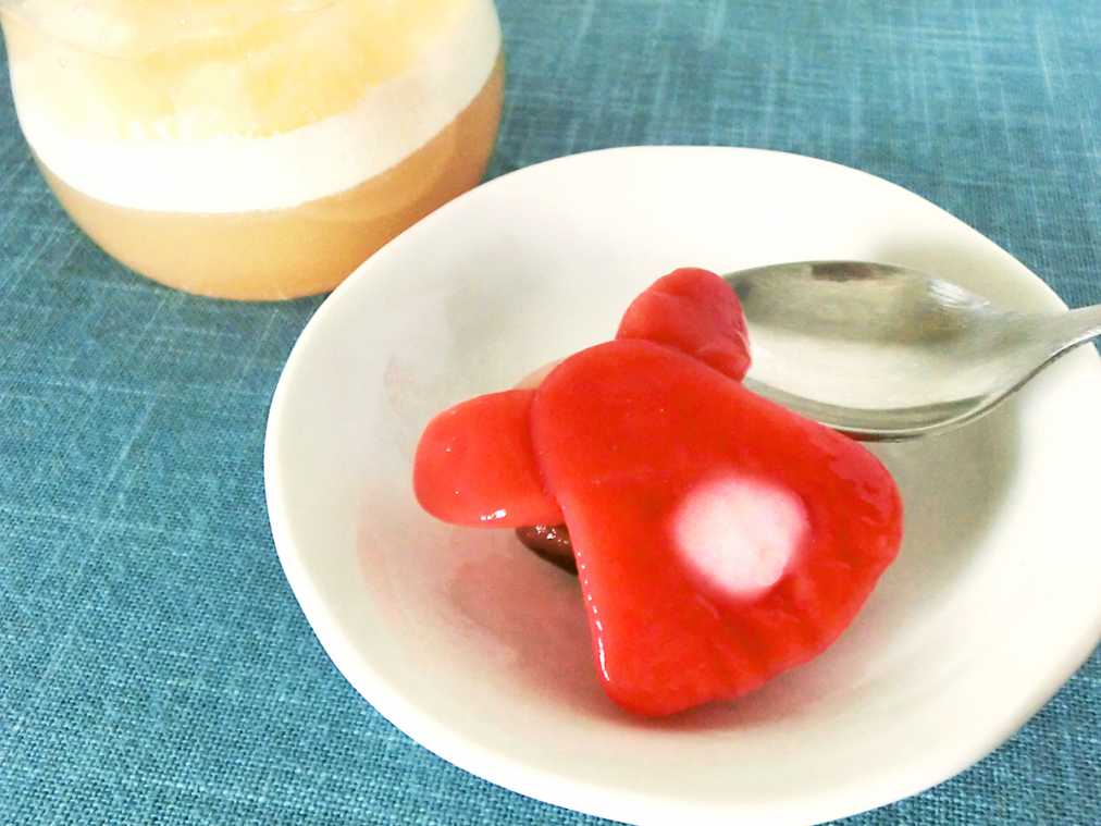 まずはポニョをお皿に取り出して、桃のゼリーを堪能するのがおすすめ!