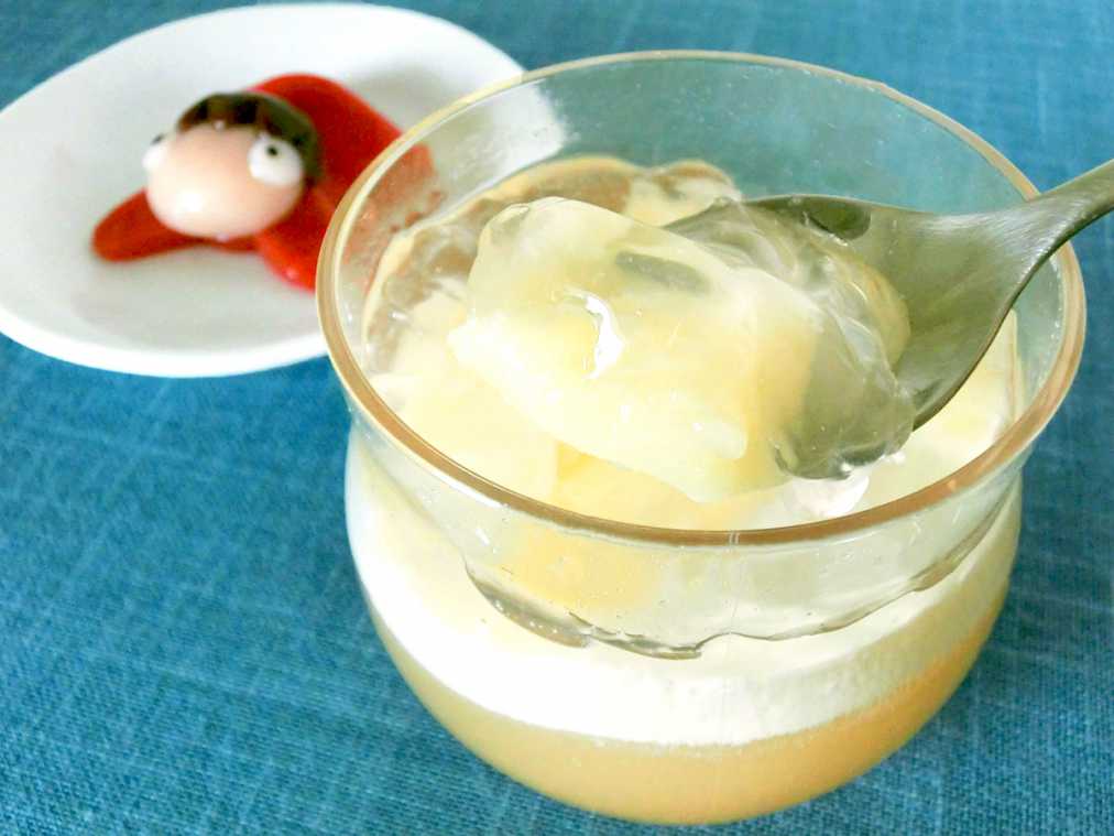 白髭さんが「4層のゼリーは一緒に食べすすむのがおすすめ」というので、底までスプーンを入れて食べてみます。ふるふる、ふわふわ、ぷるぷる、とろとろの絶妙に食感を変えた4種のゼリーが見事に共演。いちばん底の甘酸っぱいあんずゼリーがいい仕事をしています!