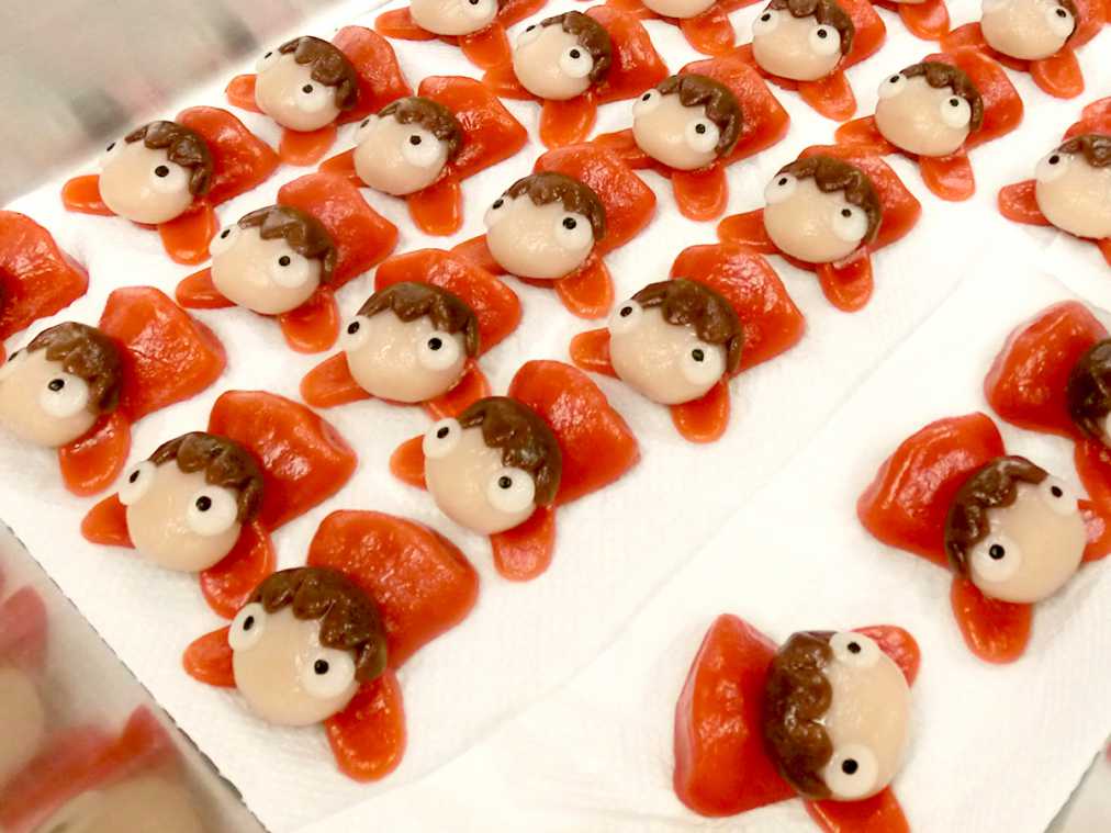 今回、白髭さんのご好意でポニョを作っている様子を見学させてもらいました。練った白玉粉を顔、髪、体、目玉の色に着色してから成形していきます。小さな目玉も白玉で作っているとは驚き!